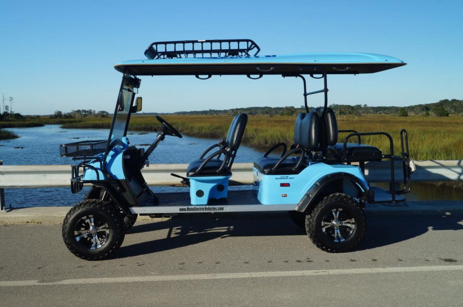 Moto Electric Vehicles’ Golf Cart Cargo Carrier is the perfect accessory if a customer is looking for some extra storage. With this option installed, the customer can throw any belongings above the roof, freeing up space for more passengers! If you are interested in this option, please call the office and talk to one of our sales representatives!