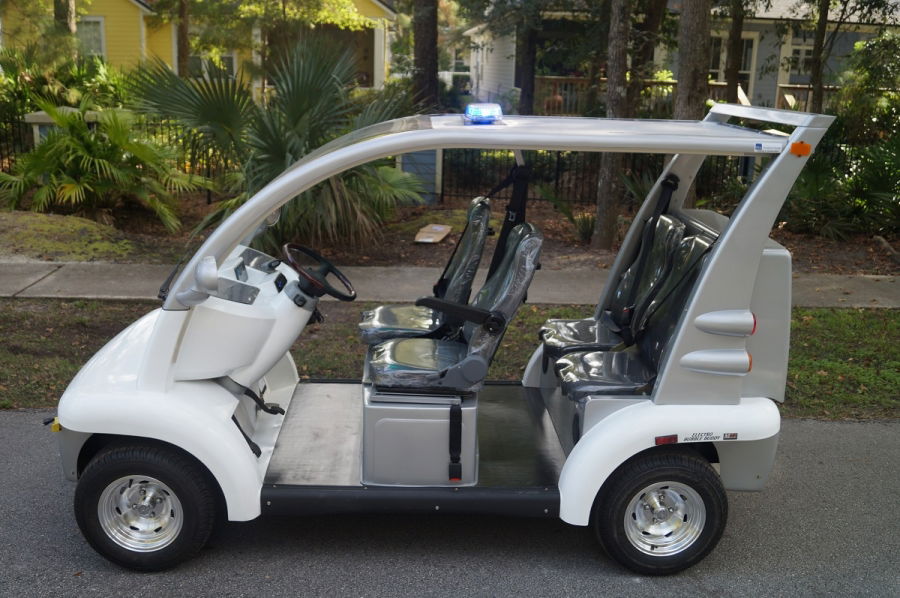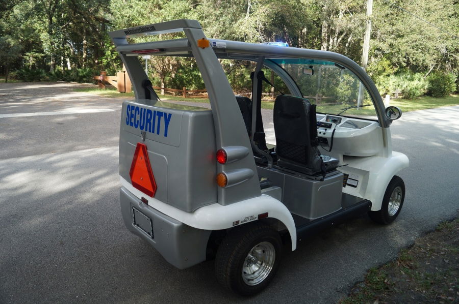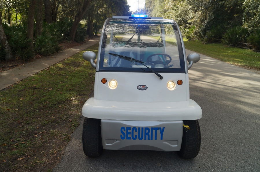 The MotoEV Electro Bubble Buddy LSV 4 Passenger Security vehicle has all the required standard features necessary to certify the unit as street legal and thus to drive on roads marked 35 MPH or less! Our Buddy LSV 4-seater security vehicle can travel an industry-leading 50 miles per charge! It costs about one penny per mile traveled if you charge your vehicle overnight, when electric power is at its cheapest! Our built in on board chargers not only keep our batteries ready to go but also contain a microprocessor so they will never overcharge. Once a full charge is detected, they simply turn themselves off! You will be able to "opportunity charge" your security golf cart at anytime while on a break, shopping or simply at lunch because your charger will be contained right on the vehicle.