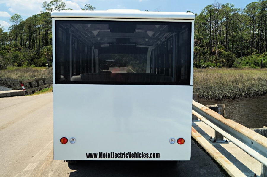 The MotoEV Transit Buddy line of vehicles are for those shuttle chores required around your Campus, Parking Lot, Town Center, Resort, or Facility. Some of these models may hold up to 46 passengers when our tag along trailer is purchased! With this option, a second bank of batteries can be installed within the trailer to increase travel distances greatly! On your MotoEV 23-passenger electric transit shuttle, we can add many options such as back up cameras, DVD Players, heaters, fans and even air conditioning when necessary! Smaller shuttles have a 48-volt system as a power source with a single battery charger. Our larger shuttles (12-46 Passenger Shuttles) contain two 48 volt systems for the longer range and quicker charging than a 72 volt “series” battery system. Our shuttles come standard with two chargers not one and each charger is responsible to charge only one bank of 48 volts of batteries. This decreases necessary charging time by half versus having one charger responsible for charging all batteries. Several models will qualify for the Low Speed Vehicle standards necessary to drive them on public roadways as well. Please consult a Moto Electric Salesperson for more specific details on this requirement.