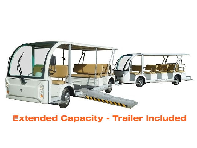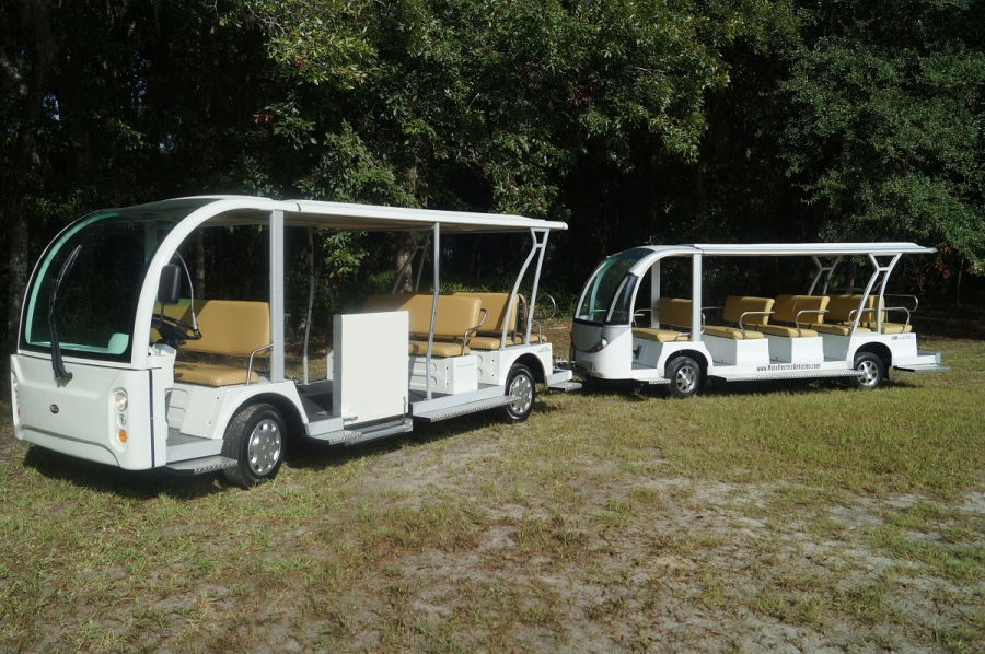 The MotoEV Transit Buddy line of vehicles are for those shuttle chores required around your Campus, Parking Lot, Town Center, Resort, or Facility. Some of these models may hold up to 46 passengers when our tag along trailer is purchased! With this option, a second bank of batteries can be installed within the trailer to increase travel distances greatly! On your MotoEV Transit Buddy, we can add many options such as back up cameras, DVD Players, heaters, fans and even air conditioning when necessary! Smaller shuttles have a 48-volt system as a power source with a single battery charger. Our larger shuttles (12-46 Passenger Shuttles) contain two 48 volt systems for the longer range and quicker charging than a 72 volt “series” battery system. Our shuttles come standard with two chargers not one and each charger is responsible to charge only one bank of 48 volts of batteries. This decreases necessary charging time by half versus having one charger responsible for charging all batteries. Several models will qualify for the Low Speed Vehicle standards necessary to drive them on public roadways as well. Please consult a Moto Electric Salesperson for more specific details on this requirement.